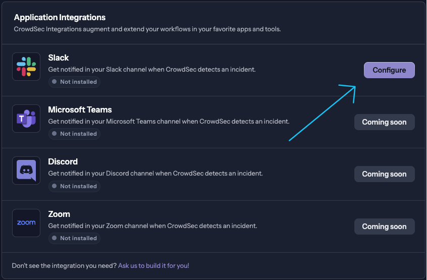 - In the CrowdSec Console, navigate to Settings > Integrations and then select Configure in the Slack row.